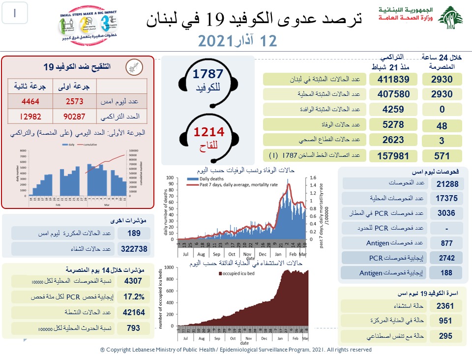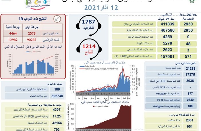 محليات وزارة الصحة اللبنانية: تسجيل 2930 إصابة جديدة بفيروس كورونا و 48 حالة وفاة By F.S مارس 12, 2021 لا توجد تعليقات featured وزارة الصحة