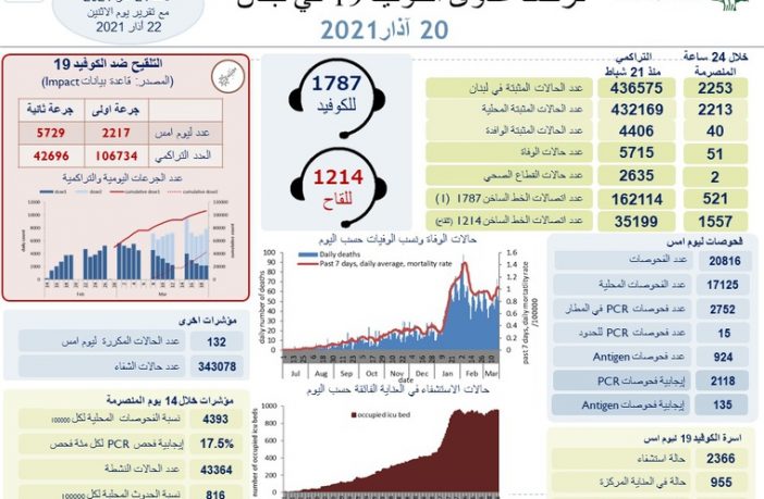 محليات وزارة الصحة: 51 حالة وفاة و2253 إصابة كورونا جديدة في لبنان By F.S مارس 20, 2021 لا توجد تعليقات featured وزارة الصحة