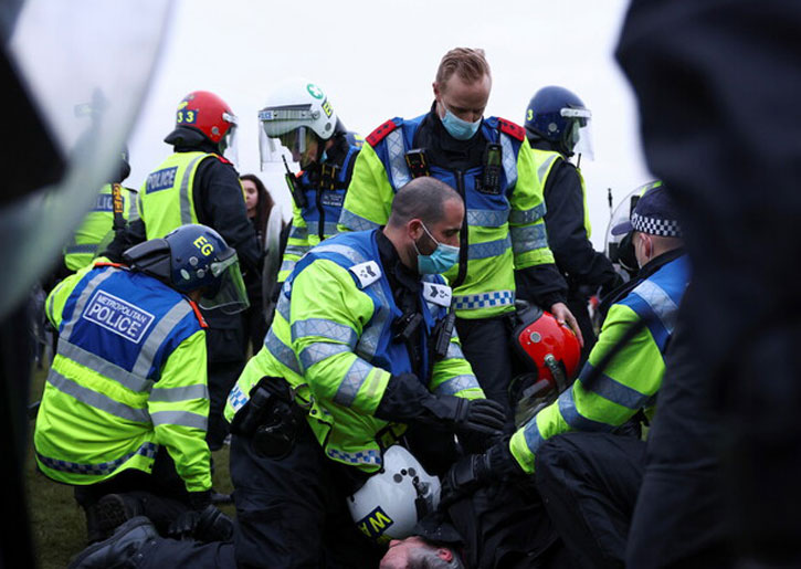 وقعت اشتباكات بين الشرطة البريطانية ومحتجين مناهضين للعزل العام جراء كورونا، خلال مسيرة في وسط العاصمة البريطانية لندن.