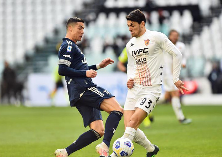 رونالدو كاد أن يتقدم بهدف أول سريع ليوفنتوس بعد مرور دقيقتين، بعدما استلم الكرة على حدود المنطقة من جهة اليمين وتوغل ليطلق تسديدة قوية مرت بجوار القائم الأيمن لمرمى بينفينتو.