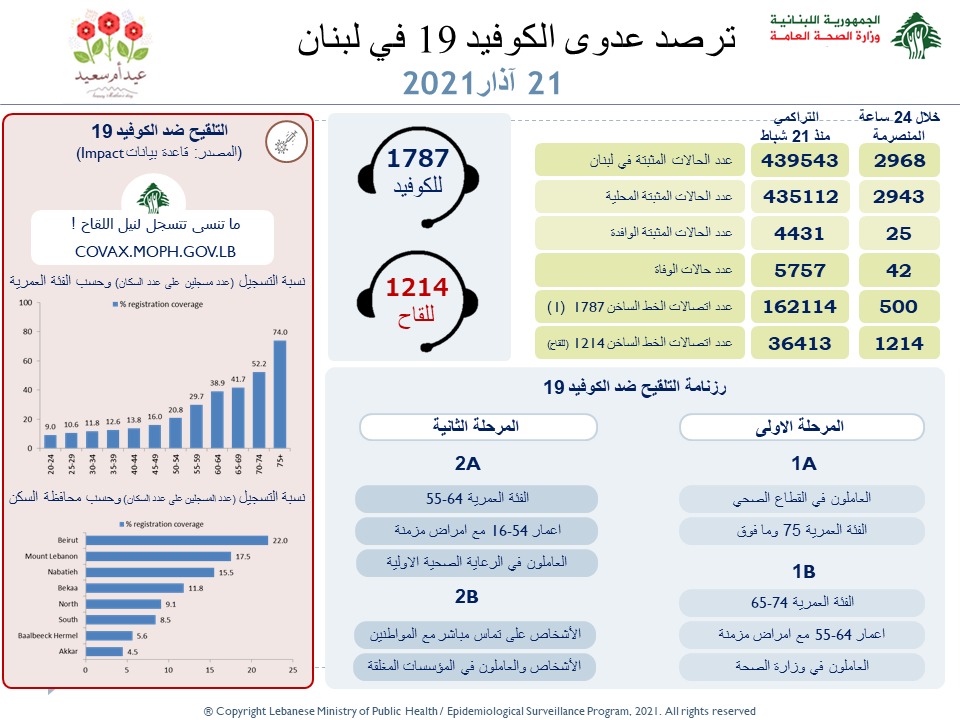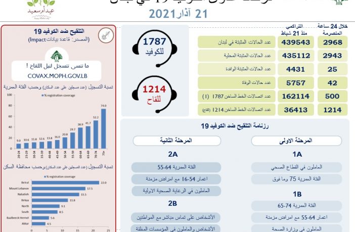 محليات وزارة الصحة اللبنانية: تسجيل 2968 إصابة جديدة و 42 حالة وفاة بفيروس كورونا By F.S مارس 21, 2021 لا توجد تعليقات featured وزارة الصحة اللبنانية