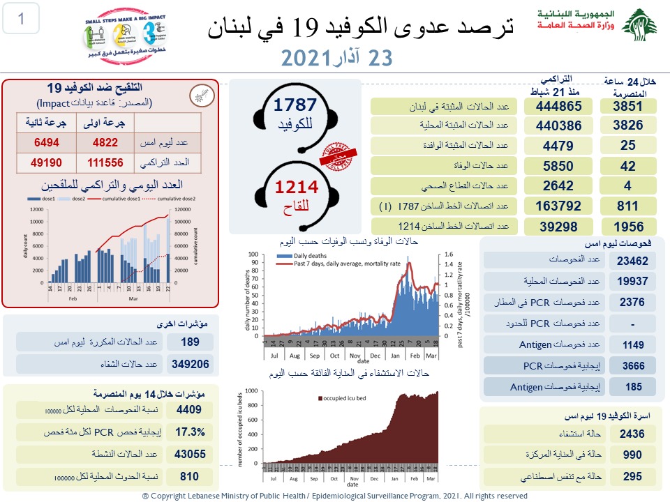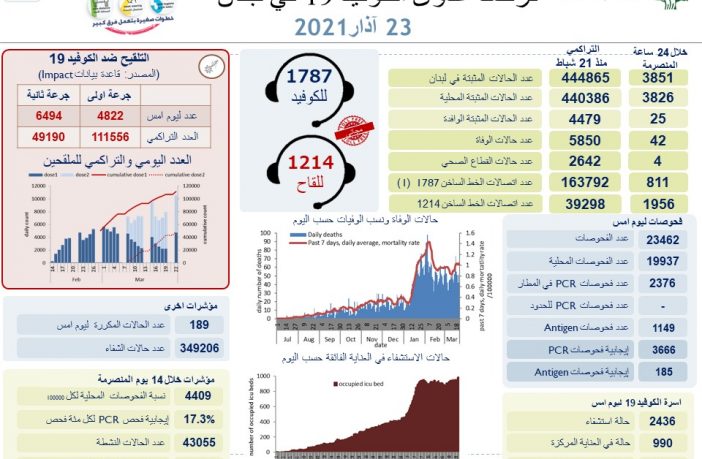 محليات وزارة الصحة: 42 حالة وفاة و3851 إصابة جديدة بفيروس كورونا By F.S مارس 23, 2021 لا توجد تعليقات featured وزارة الصحة