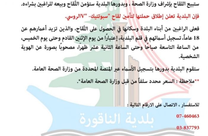 محليات بلدية الناقورة تعلن إطلاق حملتها لتأمين لقاح سبوتنيك7 الروسي By F.S مارس 27, 2021 لا توجد تعليقات الناقورة