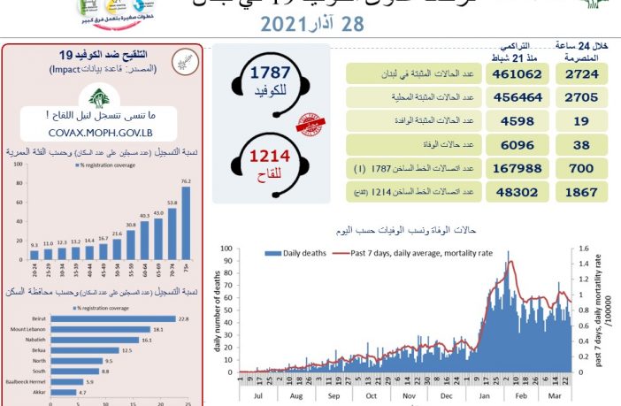محليات وزارة الصحة: 38 حالة وفاة و2724 إصابة كورونا جديدة By F.S مارس 28, 2021 لا توجد تعليقات featured كورونا