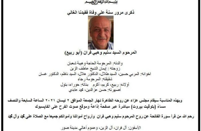 محليات مجلس عزاء في الذكرى السنوية للمرحوم سليم وهبي فران عبر صفحة إذاعة وموقع صوت الفرح على الفيسبوك.. الجمعة 2 نيسان By F.S مارس 31, 2021 لا توجد تعليقات فران