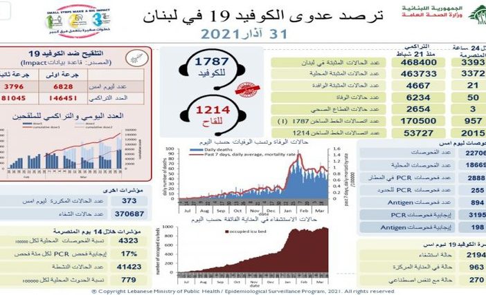 محليات وزارة الصحة: تسجيل 3393 إصابة جديدة بكورونا و50 حالة وفاة By F.S مارس 31, 2021 لا توجد تعليقات featured وزارة الصحة