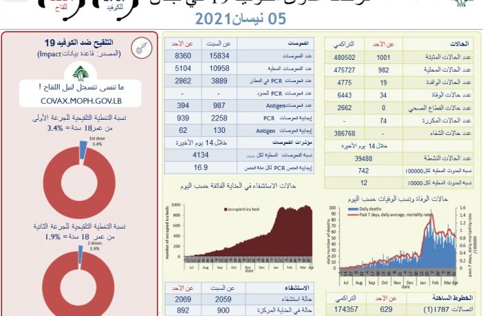 محليات وزارة الصحة اللبنانية: تسجيل 1001 إصابة جديدة بفيروس كورونا و34 حالة وفاة By F.S أبريل 5, 2021 لا توجد تعليقات featured وزارة الصحة