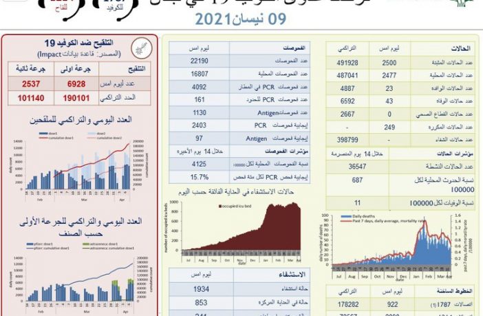 محليات وزارة الصحة: تسجيل 43 وفاة و2500 إصابة جديدة بفيروس كورونا By F.S أبريل 9, 2021 لا توجد تعليقات featured وزارة الصحة