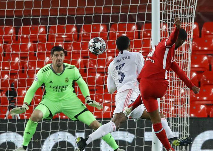 وأرسل أرنولد، كرة عرضية داخل منطقة جزاء ريال مدريد، لزميله ساديو ماني الذي سدد الكرة بجانب القائم الأيمن لكورتوا في الدقيقة 38.