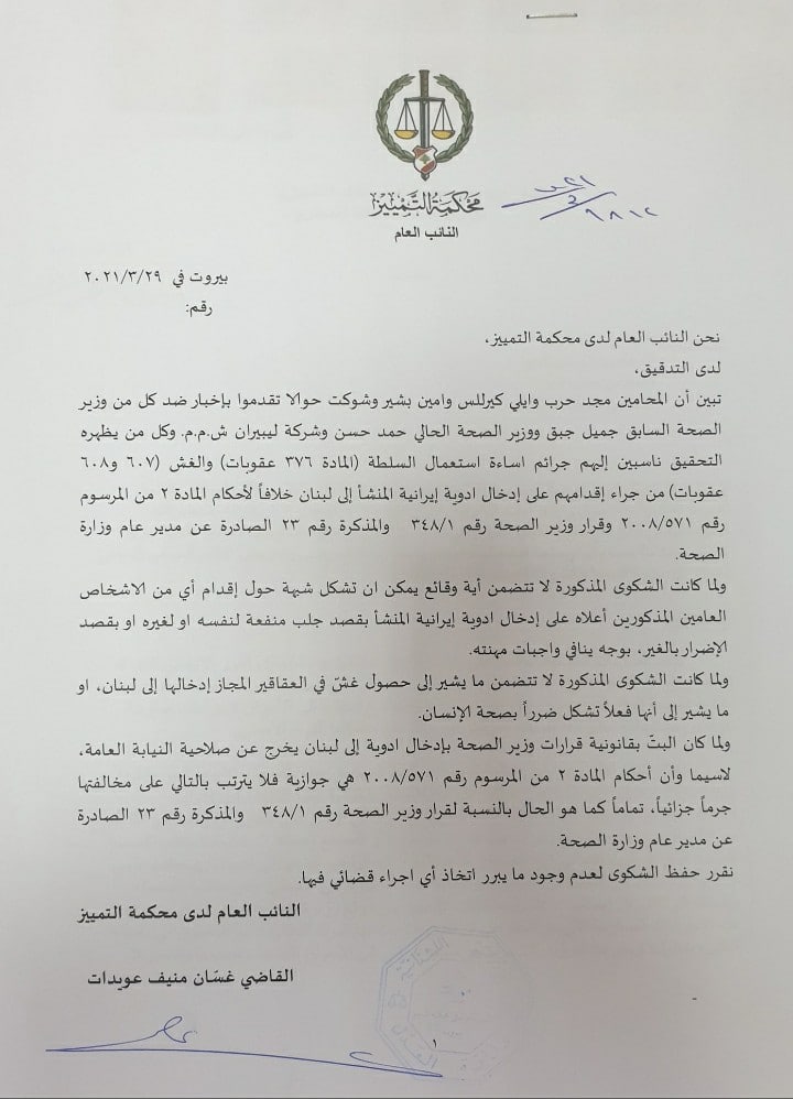 محليات القاضي عويدات قرر حفظ إخبار الأدوية الإيرانية.. خاوٍ من الوقائع! By F.S أبريل 26, 2021 لا توجد تعليقات قرر النائب العام لدى محكمة التمييز القاضي غسان عويدات حفظ الاخبار بمسألة الادوية الإيرانية لانه خاو من الوقائع، ولان قرار وزير الصحة بإدخال أدوية الى لبنان يخرج عن صلاحية النيابة العامة. وجاء في قرار القاضي عويدات. القاضي عويدات