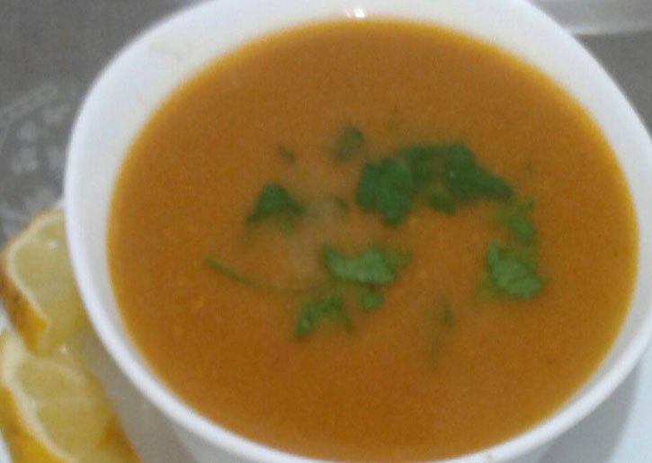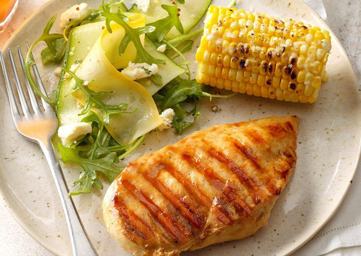 العشاء. قطعة متوسطة الحجم من لحم الدجاج المشوي مع القليل من الخضار المشوية، كوب صغير من العدس المطهو على البخار مع القليل من عصير الليمون وزيت الزيتون.