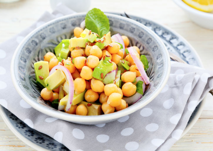 الغداء. طبق من سلطة الحمص مع شرحات من الافوكادو، كوب من حليب جوز الهند.
