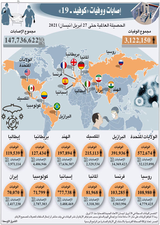 وتأكدت إصابة أكثر من 147.736.620 شخصا بالفيروس منذ ظهوره. وتعافت الغالبية العظمى من المصابين رغم أن البعض استمر في الشعور بالأعراض بعد أسابيع أو حتى أشهر. وتستند الأرقام إلى التقارير اليومية الصادرة عن السلطات الصحية في كل بلد وتستثني المراجعات اللاحقة من قبل الوكالات الإحصائية، كما في روسيا وإسبانيا وبريطانيا. وسجلت الاثنين 10.840 وفاة إضافية و715.609 إصابات جديدة في العالم.