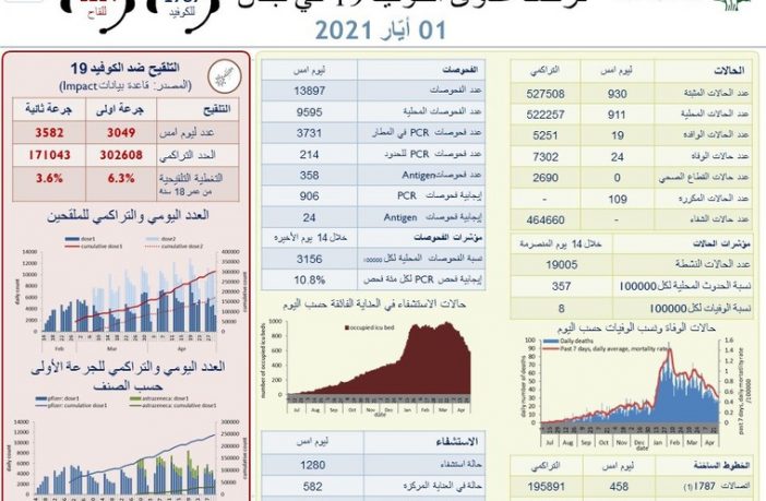 محليات وزارة الصحة: تسجيل 24 وفاة و930 إصابة جديدة بكورونا By F.S مايو 1, 2021 لا توجد تعليقات featured وزارة الصحة
