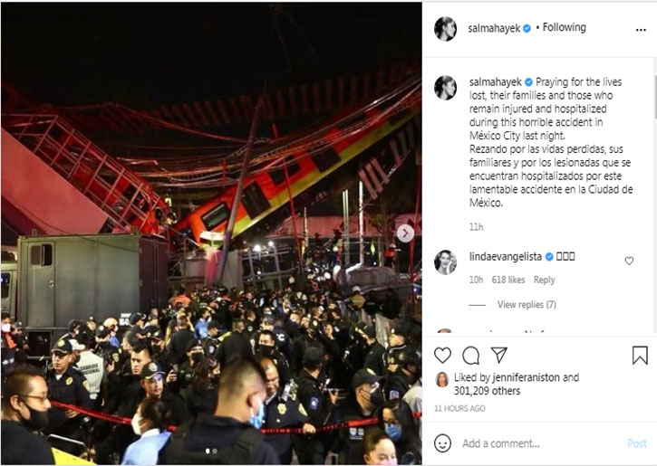 شهدت المكسيك مؤخرا حادث مروع وهو انهيار جسر على بعض السيارات وفقد فيه العديد من الأرواح إضافة الي المصابين، وهو ما أحزن النجمة المكسيكية العالمية سلمي حايك، حيث نشرت صور من الحادث علي الانستجرام الخاص بها وعلقت عليها بـ” نصلي من أجل الأرواح المفقودة وعائلاتهم ومن بقي مصابًا ومعالجًا خلال هذا الحادث المروع الذي وقع في مدينة مكسيكو الليلة الماضية”