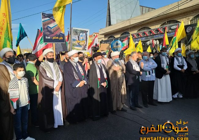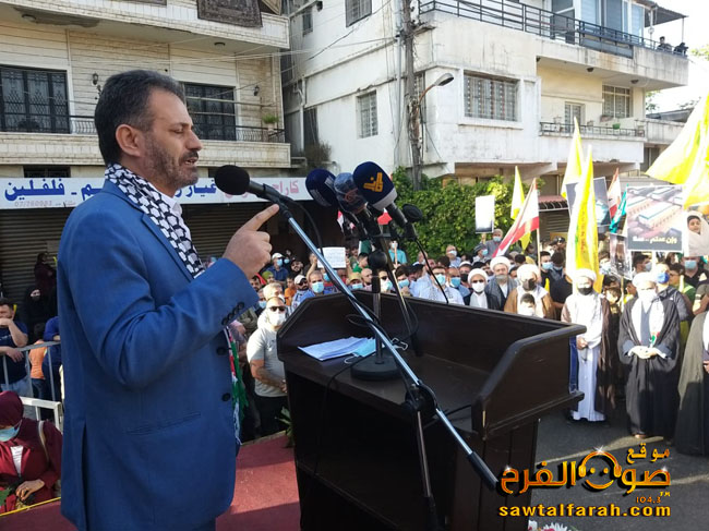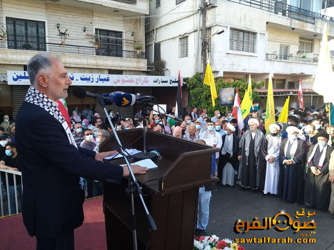 والقى الوزير السابق محمد فنيش كلمة حزب الله وقال فيها ان الذين طعنوا القضية الفلسطينية طعنوها مرتين مرة عندما تخاذلوا عن نصرة أهلها ومقاومتها ووسموا المقاومة بالإرهاب ومرة أخرى عندما غرسوا خناجرهم بظهر هذا الشعب الفلسطيني وأذعنوا لارادة السيد الاميريكي فوقعوا اتفاقيات التطبيع ، هؤلاء مدعوون اليوم الى التكفير عن جريمتهم والتراجع عن فعل الخيانة تعبيرا عن تفاعلهم مع شعبهم ، مع وجدان شعبهم ، مع شعور أهلهم وابنائهم ، وان يكفوا عن ارتكاب هذا الفعل الخياني ، ان الامل يكبر بهذا الجيل الشاب وبهذه المقاومة والحلم بات قريبا ، لان هناك معادلة قوية جدا تمتد من لبنان الى فلسطين الى سوريا الى العراق الى اليمن ، الى النعمة الإلهية الكبرى المتمثلة بالجمهورية الإسلامية الإيرانية التي وقفت وتقف بكل شموخ وفية لخط الامام الخميني ، ومعبرة عن تحقيق مشروع تحرير الامة وتحرير فلسطين ، هذه النعمة الإلهية وبفضلها استفادت المقاومة في لبنان والمقاومة في فلسطين وهنا نستذكر الدماء الطاهرة التي بذلت من قائد فيلق القدس الشهيد قاسم سليماني .