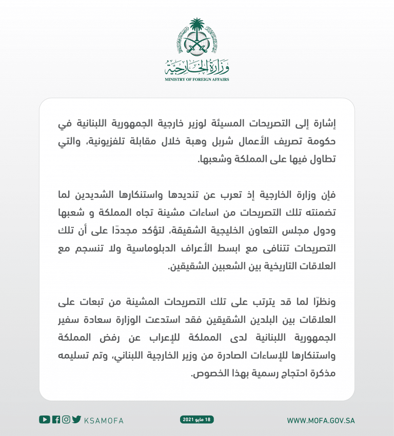 محليات الخارجية السعودية تصدر بياناً بعد تصريحات وزير الخارجية والمغتربين شربل وهبة! By F.S مايو 18, 2021 لا توجد تعليقات استدعت وزارة الخارجية السعودية السفير اللبناني في الرياض للإعراب عن رفض المملكة واستنكارها لتصريحات وزير الخارجية اللبناني في حكومة تصريف الأعمال شربل وهبة. شربل وهبة