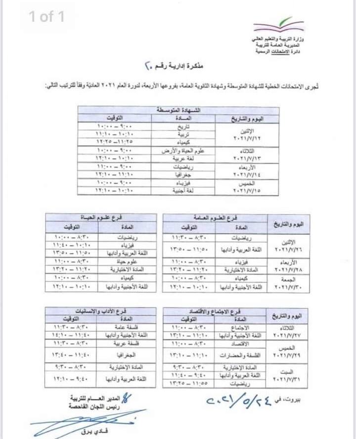 صدر المدير العام للتربية رئيس اللجان الفاحصة الأستاذ فادي يرق ،المذكرة الإداريـة رقــم 20 التي حدد فيها توزيع المواد الدراسية على أيام الإمتحانات الرسمية، وجاء فيها: