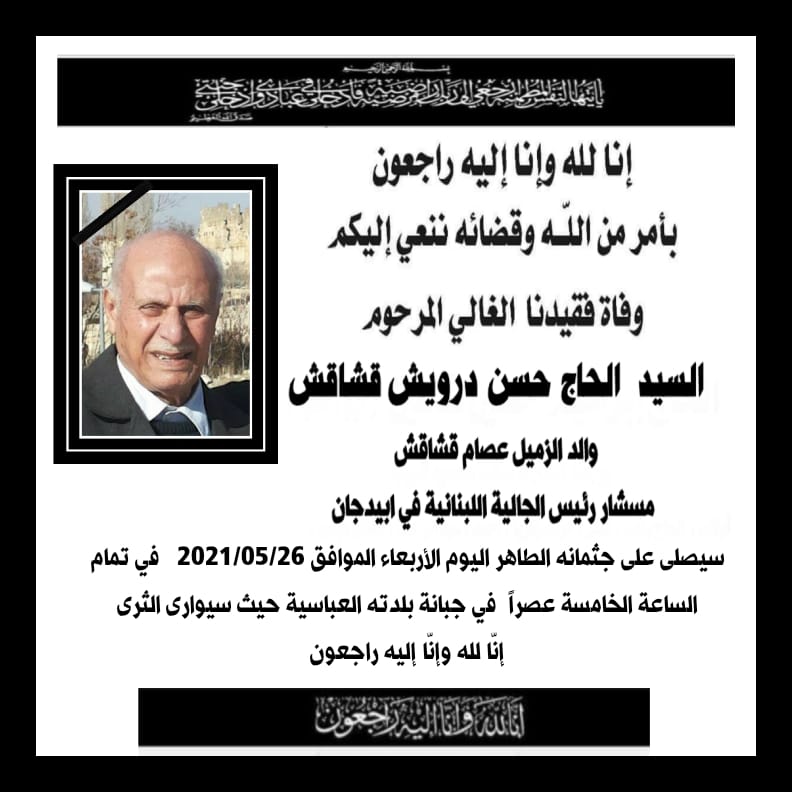 سيجري الدفن نهار هذا اليوم الأربعاء 26 / 05 / 2021 في تمام الساعة الخامسة عصرا في جبانة بلدته العباسية.