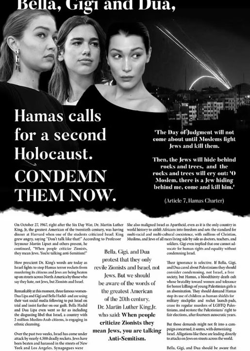 وأشار الإعلان إلى السيدات الثلاثة بأنهن من “أبرز الشخصيات المؤثرة” التي شوهن “الدولة اليهودية” و”اتهمن إسرائيل بالتطهير العرقي”، بحسب موقع “الدايلي ميل” البريطاني. وتضمن الإعلان صورة للسيدات الثلاث مرفقة بعنوان: “حماس تدعو إلى إبادة ثانية. فلنحاسب الآن”.