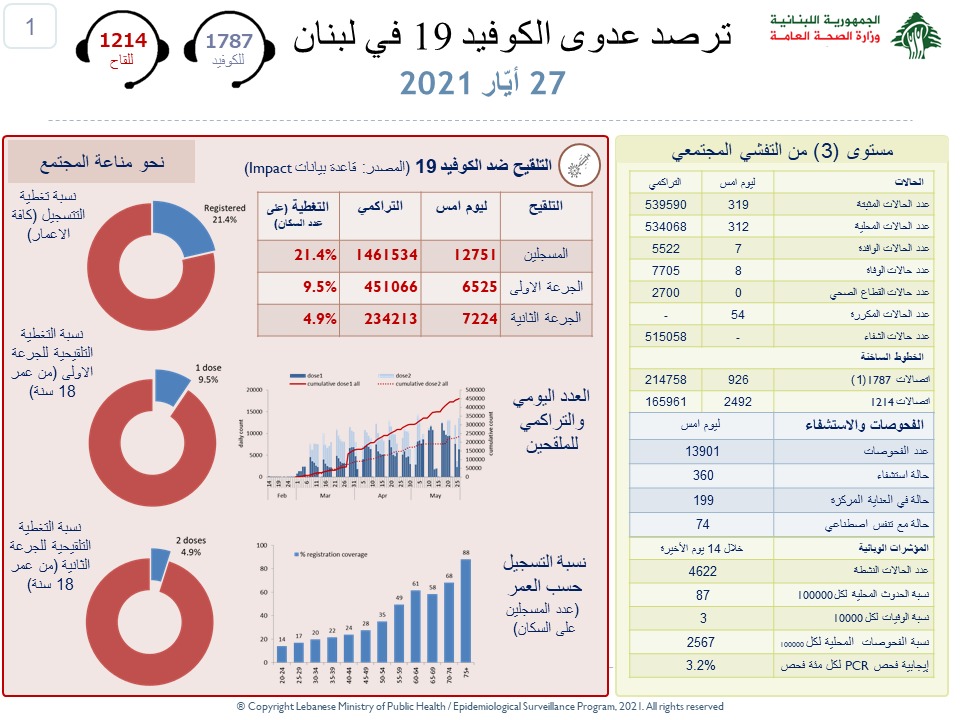محليات وزارة الصحة: تسجيل 319 اصابة جديدة بكورونا و8 حالات وفاة By F.S مايو 27, 2021 لا توجد تعليقات featured