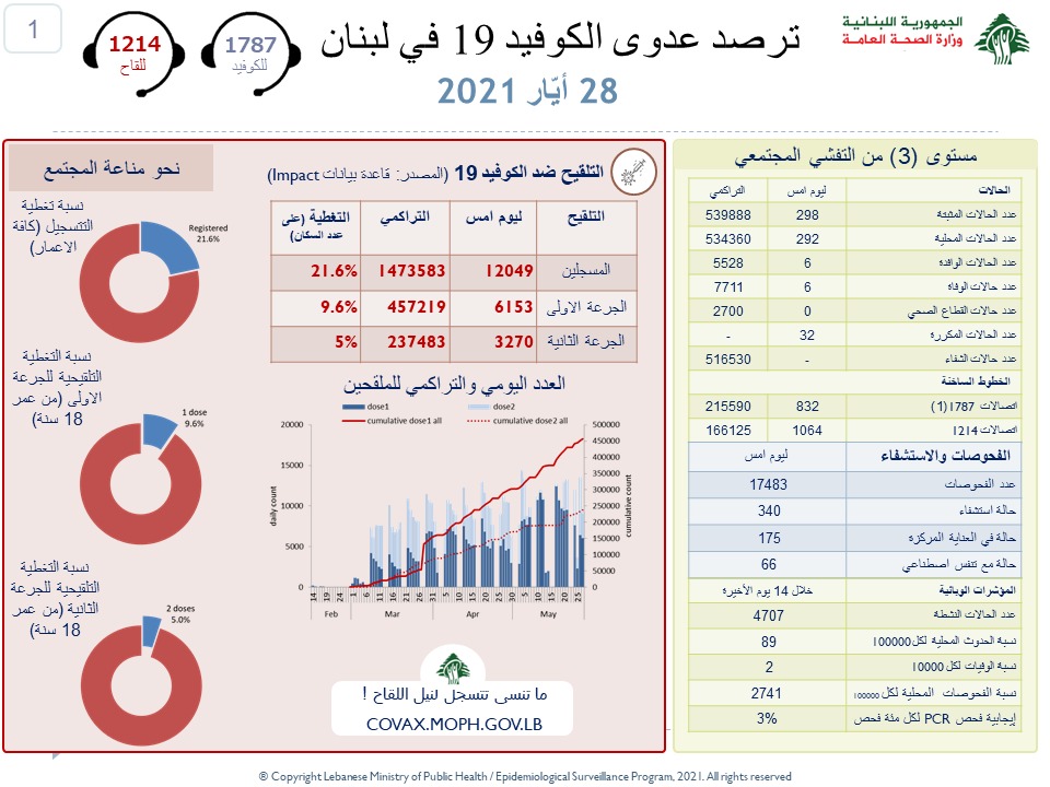 محليات وزارة الصحة: تسجيل 298 إصابة جديدة و6 وفيات بفيروس كورونا By F.S مايو 28, 2021 لا توجد تعليقات featured وزارة الصحة