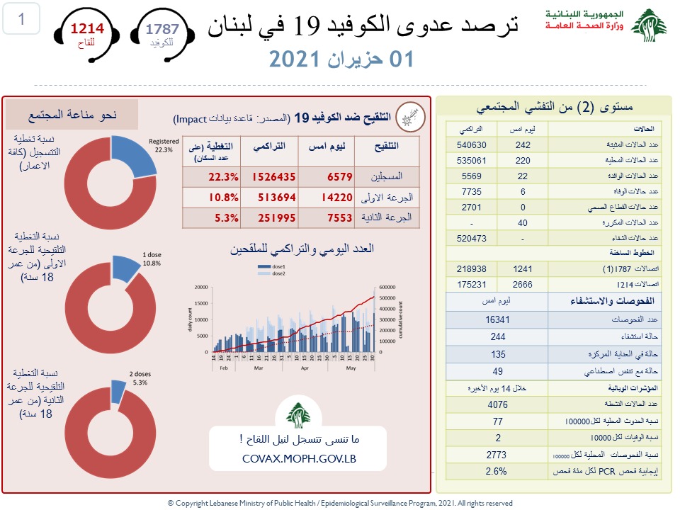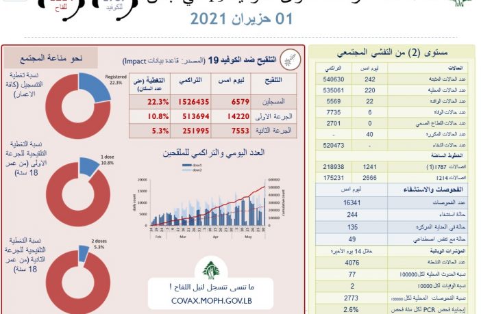 محليات وزارة الصحة: تسجيل 242 إصابة جديدة بكورونا و6 حالات وفاة By F.S يونيو 1, 2021 لا توجد تعليقات featured