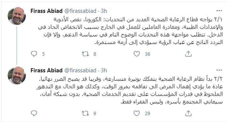 تحذير أبيض، جاء عبر حسابه على «تويتر» حيث غرّد متناولاً التحديات التي يواجهها قطاع الرعاية الصحية، «من وباء« الكورونا»، ونقص الأدوية والإمدادات الطبية، ومغادرة العاملين للعمل في الخارج بسبب الانخفاض الحاد في الدخل»، لافتاً إلى أن مواجهة هذه التحديات «يتطلب الوضوح التام في سياسة الدعم»، في حين أن «التردد الناتج عن غياب الرؤية سيؤدي إلى أزمة مستمرة».