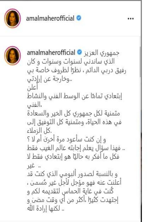 وكتبت آمال ماهر منشوراً قالت فيه: «جمهوري العزيز الذي ساندني لسنوات وسنوات، وكان رفيق دربي الدائم، نظراً لظروف خاصة بي وخارجة عن إرادتي.. أُعلن ابتعادي تماماً عن الوسط الفني والنشاط الفني، متمنية لكل جمهوري كل الخير والسعادة في هذه الحياة، ومتمنية كل التوفيق إلى كل الزملاء».