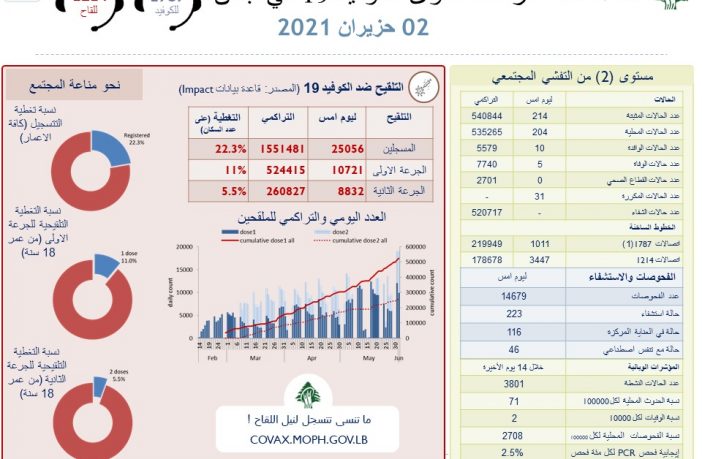 محليات وزارة الصحة: تسجيل 214 إصابة جديدة بفيروس كورونا و 5 حالات وفاة By F.S يونيو 2, 2021 لا توجد تعليقات featured