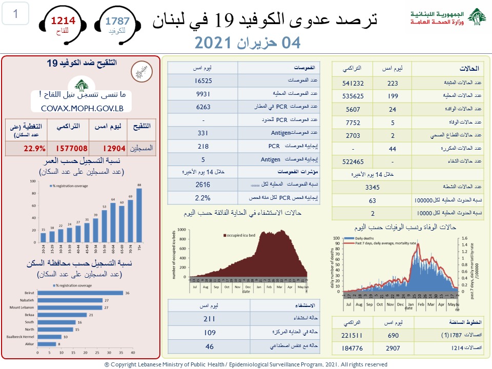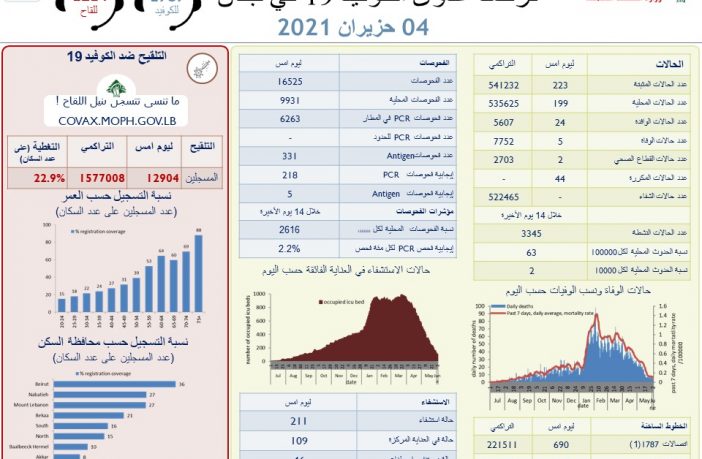 محليات وزارة الصحة: تسجيل 223 إصابة جديدة بفيروس كورونا و 5 حالات وفاة By F.S يونيو 4, 2021 لا توجد تعليقات featured وزارة الصحة