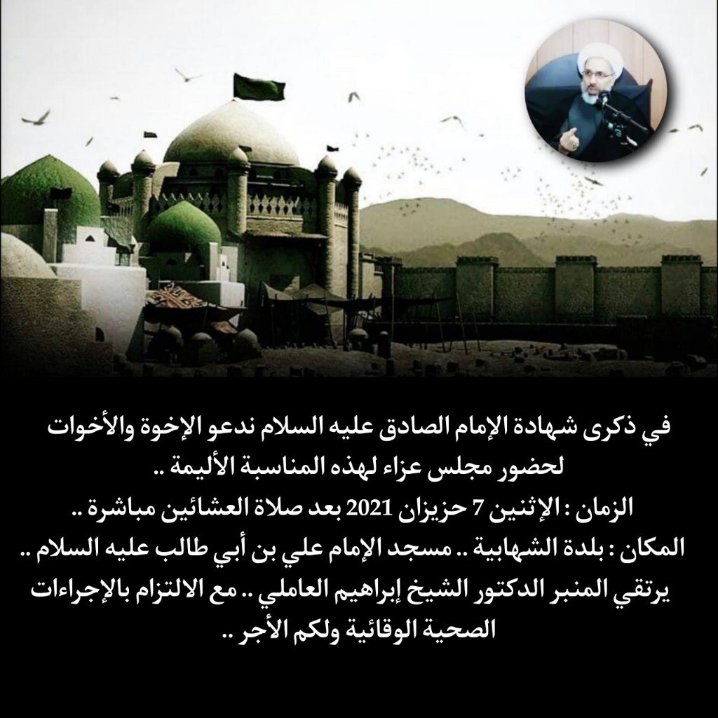مفكرة دعوة لحضور مجلس عزاء بذكرى شهادة الإمام الصادق (ع) في الشهابية By F.S يونيو 6, 2021 لا توجد تعليقات الشهابية