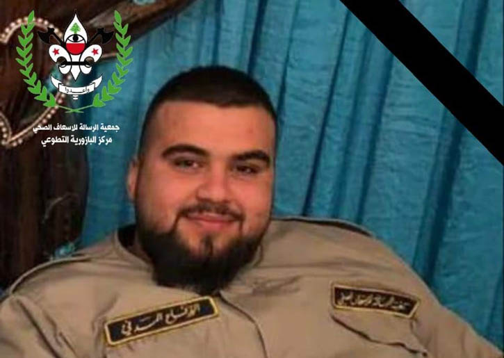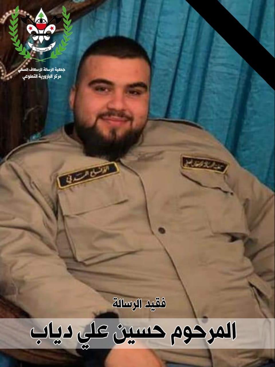 تُنعِي إليكُم جمعيّة كشافة الرّسالة الإسلاميّة، وجمعية الرسالة للإسعاف الصحي، فقيد الشباب الغالي المسعف حسين علي دياب (من مركز البازورية التطوعي) والذي وافته المنية إثر حادث سير مروع.