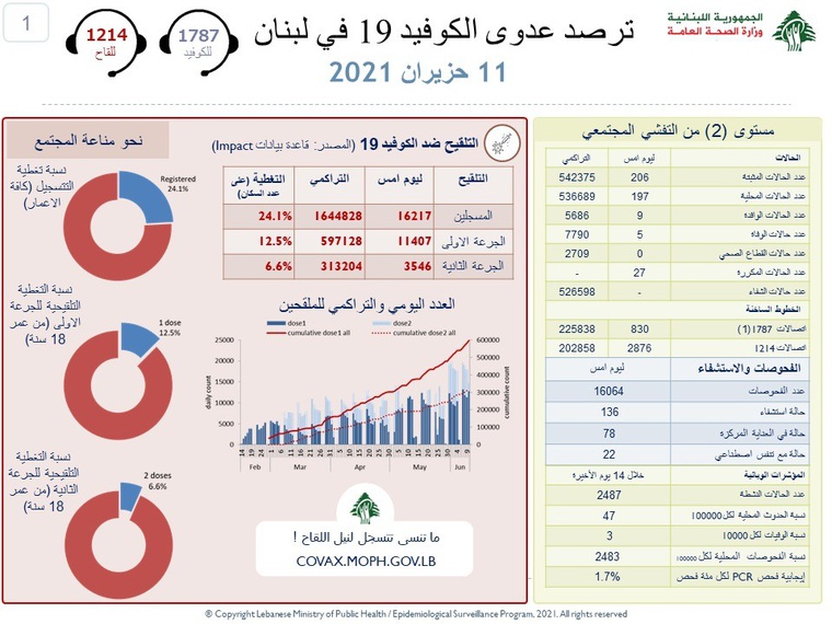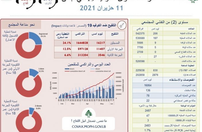 وأوضحت أنّه “تمّ تسجيل 197 إصابة بين المقيمين و9 حالات بين الوافدين”، مشيرةً إلى أنّه “تمّ تسجيل 5 حالات وفاة جديدة خلال الساعات الـ24 الماضية، ليرتفع العدد الإجمالي للوفيّات إلى 7790”. وذكرت أنّ “عدد حالات الاستشفاء ليوم أمس هو 136، من بينها 78 حالة في العناية المركّزة”، لافتةً إلى أنّ “عدد الفحوصات المخبريّة أمس هو 16064”.