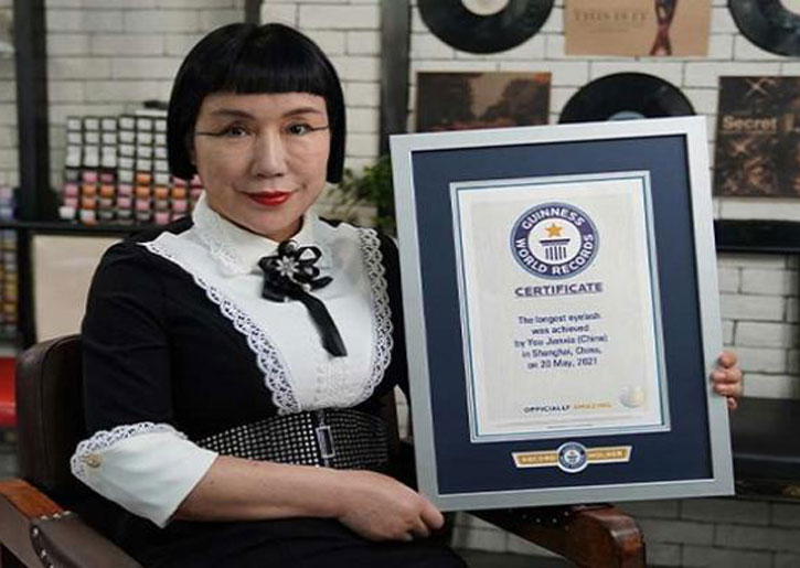 ودخلت يو جيانكسيا «غينيس» بـ 8 بوصات (20.5 سم) من الرموش، محطمة الرقم السابق والمسجل باسمها أيضاً وكان 4.88 بوصة (12.5 سم) في عام 2016، بحسب «يو بي أي» الإخبارية.