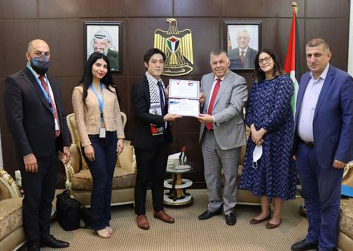 سلم القنصل العام لدولة فلسطين كردستان-العراق السفير الفلسطيني نظمي حزوري شهادة التكريم و التقدير لصديق فلسطين و المحب لشعبها السيد تاكينوري كاتو الياباني الجنسية العالمي بانسانيته. فقد كرس جهوده الكبيرة بايمان رسالته الانسانية لرعاية الاطفال المرضى و لسعادتهم ..و المؤمن بحقوق الانسان.. و لدوره الفاعل في الشبكة الطبية اليابانية في العراق و لدورها في اربيل عاصمة اقليم كردستان-العراق، مع التحضير لعودته الى اليابان و مع تكريمه لدى السفير نظمي حزوري، بحضور السيدة نوار نزال نائب السفير و الاصدقاء الاعزاء.