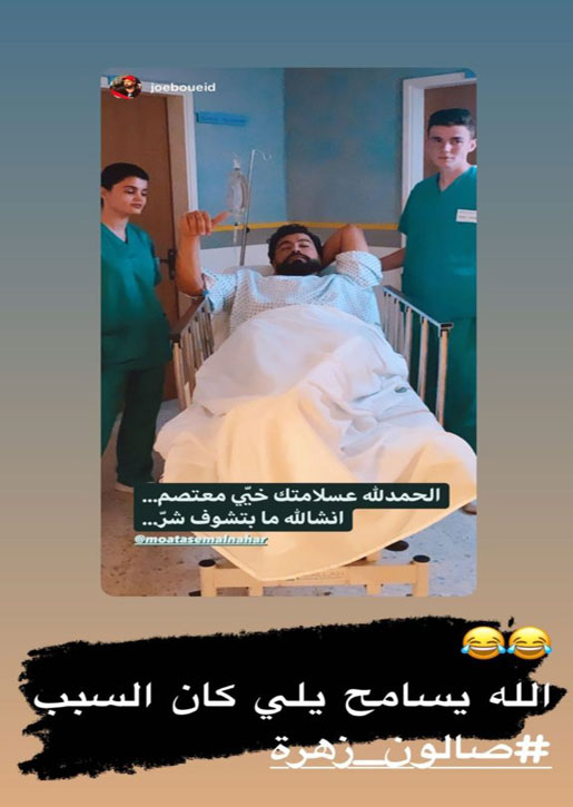 أثار المخرج جو بوعيد قلق جمهور الممثل معتصم النهار وذلك بعدما نشر في الساعات الماضية صورة للممثل السوري داخل المستشفى، حيث كان يتلقى العلاج وكتب “الحمدالله على سلامتك أخي معتصم انشالله لا ترى مكروهًا”.