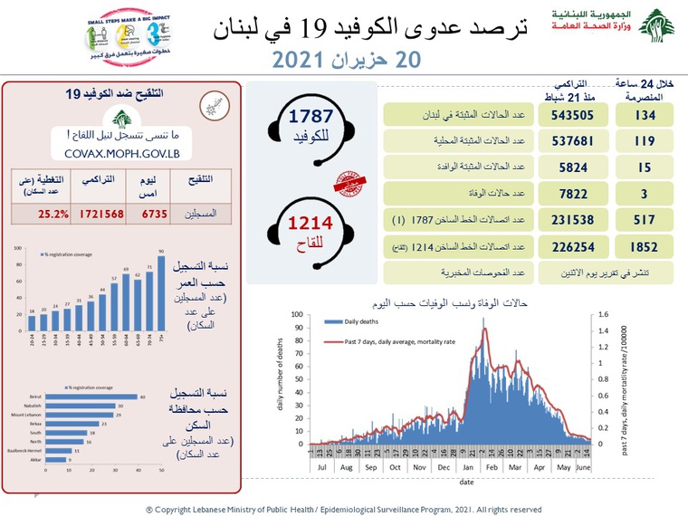 محليات وزارة الصحة: 134 إصابة جديدة و3 حالات وفاة بكورونا By F.S يونيو 20, 2021 لا توجد تعليقات featured وزارة الصحة
