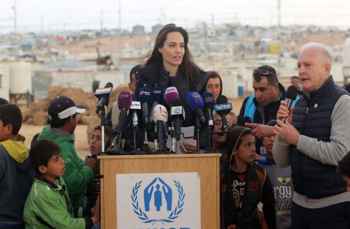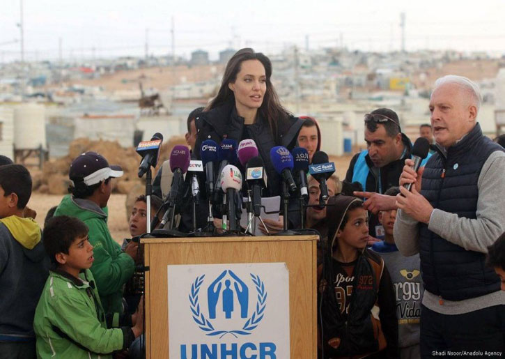 هذه الممثلة الحائزة على جائزة الأوسكار والأم لستة أطفال كانت نقطة التحول فيما يتعلق بتبنيها قضايا اللاجئين عندما كانت تصور فيلم Tomb Raider في كمبوديا. ولجأت في النهاية إلى مكتب المفوض السامي للأمم المتحدة لشؤون اللاجئين للحصول على مزيد من المعلومات.