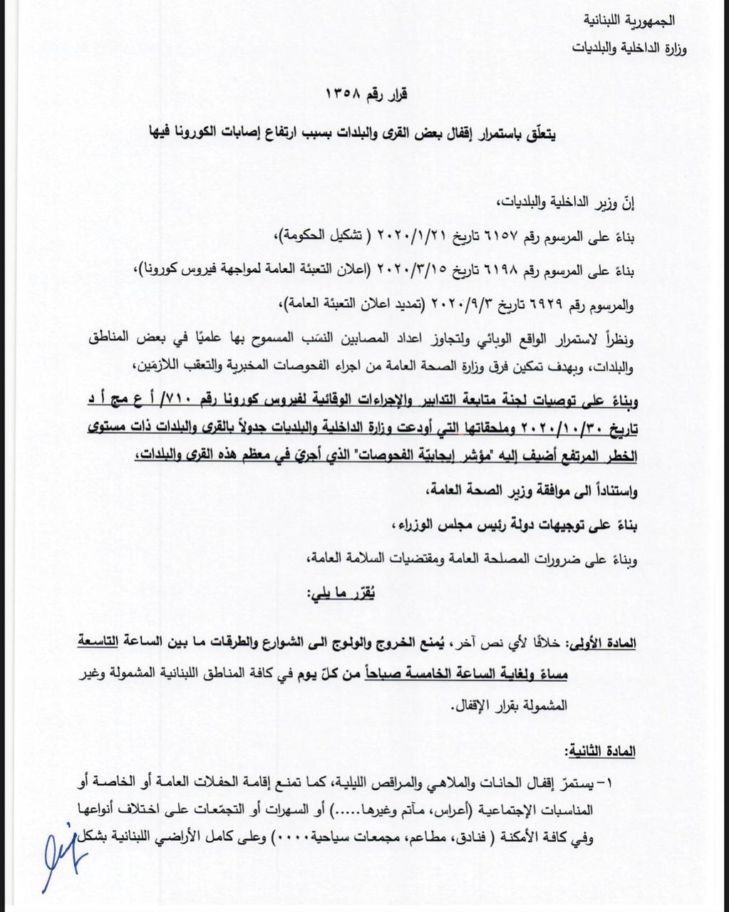 أصدر وزير الداخلية والبلديات محمد فهمي قراراً بإقفال 115 بلدة بسبب ارتفاع إصابات كورونا فيها. كما ومنع الخروج والولوج إلى الطرقات والشوارع العامة من الساعة التاسعة مساءً ولغاية الخامسة صباحاً من كل يوم في كافة المناطق اللبنانية المشمولة وغير المشمولة بقرار الاقفال.