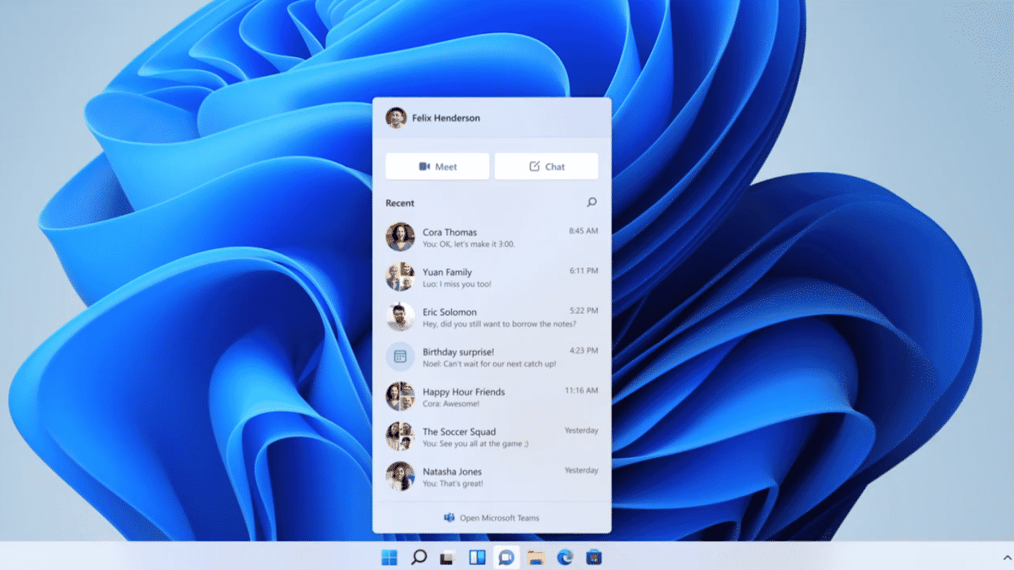 وتدمج مايكروسوفت أيضًا مايكروسوفت تيمز مباشرةً في ويندوز 11 لكل من المستهلكين والمستخدمين التجاريين.