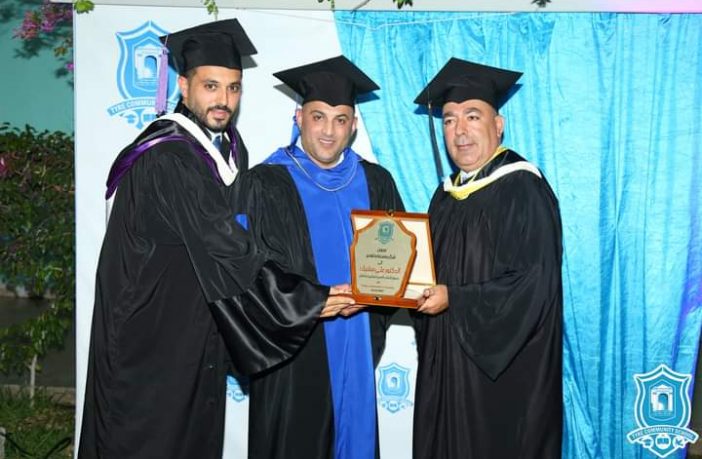 في الختام قدّم الاستاذ فؤاد خوري درعاً تقديراً للدكتور مشيك وسلّم الشهادات على المتخرجين واقيم حفل كوكتيل على شرف الخريجين .