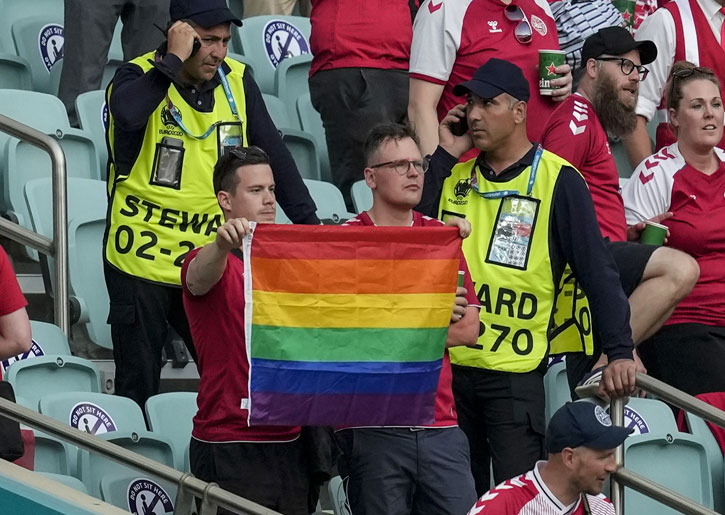 فتح الاتحاد الأوروبي لكرة القدم (اليويفا) تحقيقًا بعد أن ظهر علم قوس قزح -شعار المثليين- رفقة مشجع في استاد “باكو الوطني” في دولة أذربيجان خلال فوز الدنمارك بنتيجة 2-1 على جمهورية التشيك في ربع نهائي يورو 2020.