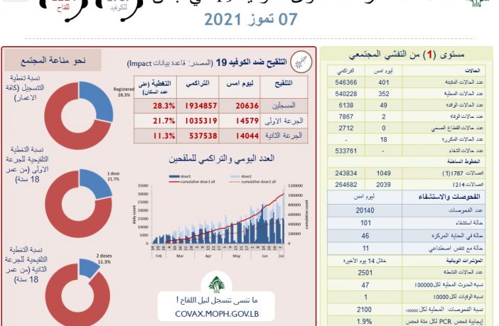 محليات وزارة الصحة: 401 إصابة جديدة بكورونا وحالتا وفاة By F.S يوليو 7, 2021 لا توجد تعليقات featured