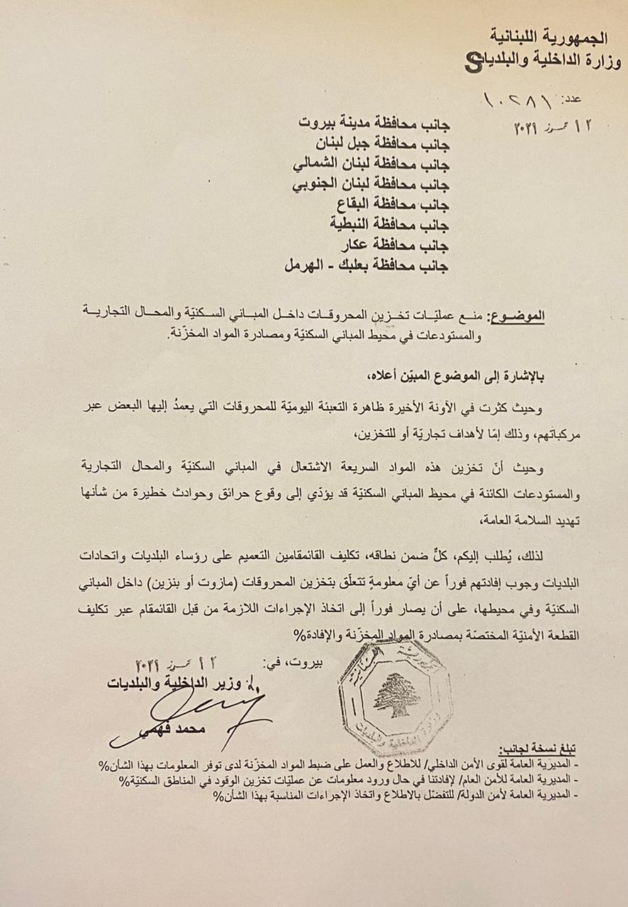 اصدر وزير الداخلية والبلديات العميد محمد فهمي، قراراً يقضي بمنع عمليّات تخزين المحروقات داخل المباني السكنية والمحال التجارية والمستودعات في محيط المباني السكنية ومصادرة المواد المخزنة.