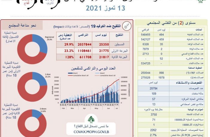 محليات وزارة الـصـحـة الـلـبـنـانـيـة: تسجيل 494 إصابة جديدة وحالتي وفاة بفيروس كورونا By F.S يوليو 13, 2021 لا توجد تعليقات featured