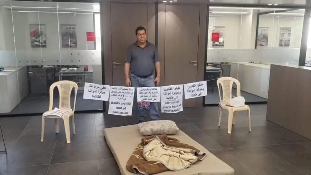 اقدم أحد المواطنين على افتراش الأرض داخل مصرف “SGBL” في بلدة اميون – الكورة وذلك بعد رفض المصرف بتحويل مبلغ 10 آلاف دولار إلى ابنه الذي يدرس خارج لبنان بحسب لبنان ٢٤.