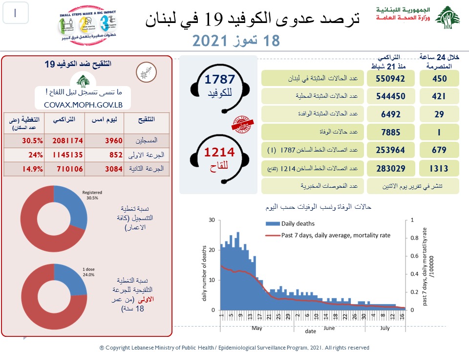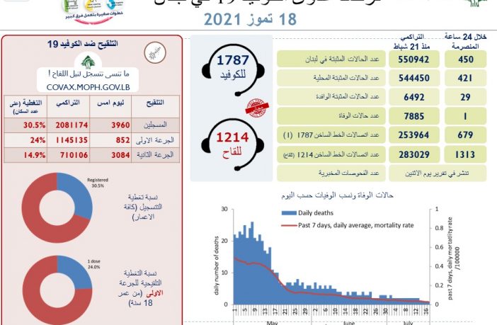 محليات وزارة الـصـحـة الـلـبـنـانـيـة: تسجيل 450 إصابة جديدة وحالة وفاة بفيروس كورونا By F.S يوليو 18, 2021 لا توجد تعليقات وزارة الصحة