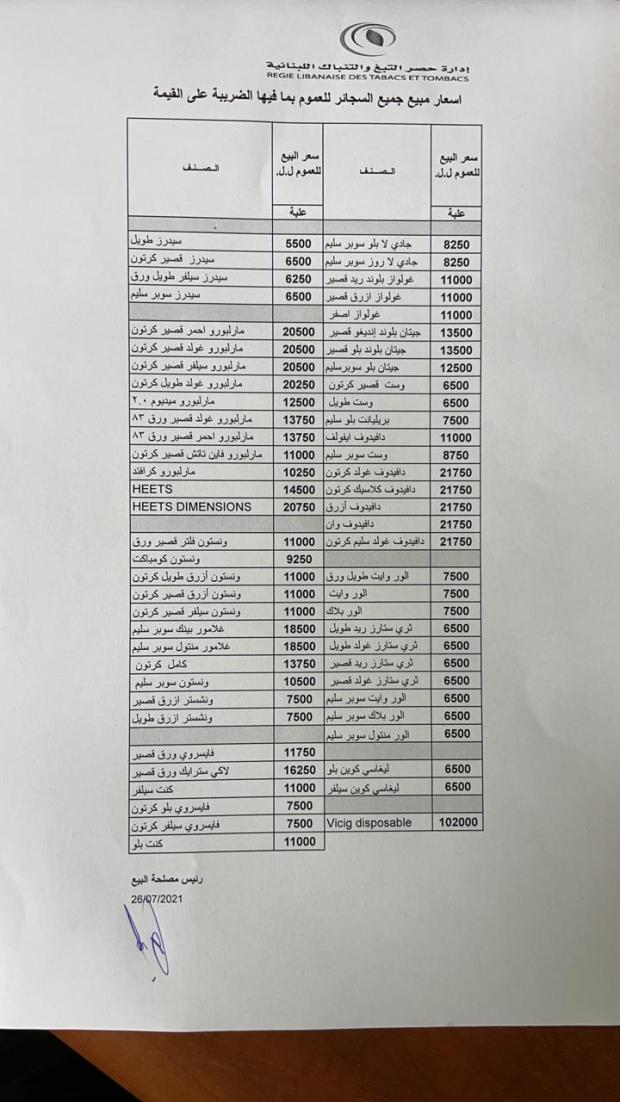 محليات لائحة أسعار جديدة للسجائر! By F.S يوليو 26, 2021 لا توجد تعليقات اعلنت إدارة حصر التبغ والتنباك عن لائحة أسعار جديدة للسجائر التي تُباع للعموم وتشمل الضريبة على القيمة المضافة. سجائر