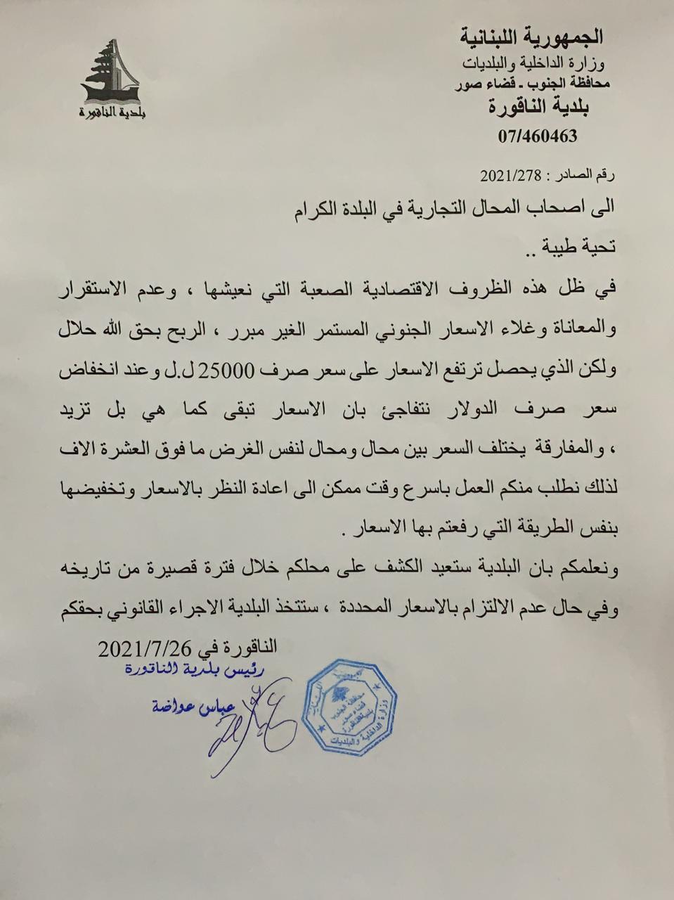 محليات بلدية الناقورة: لخفض الأسعار بنفس الطريقة التي رفعتم بها.. By F.S يوليو 26, 2021 لا توجد تعليقات الناقورة